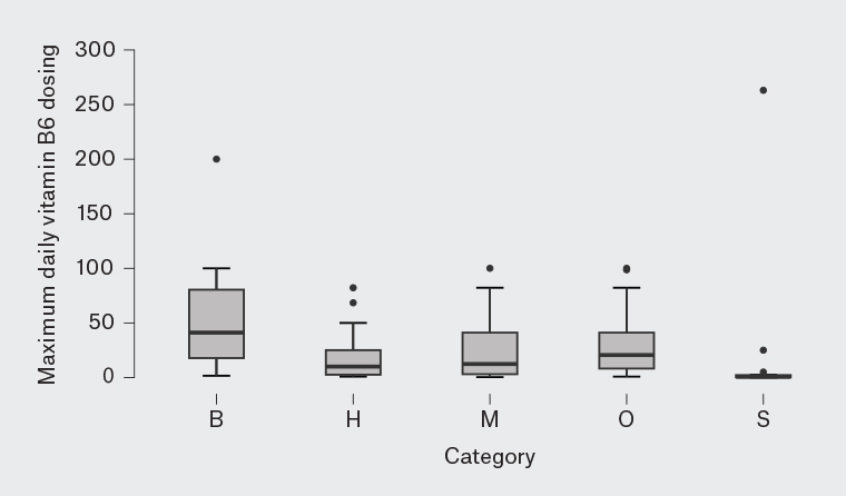 The Chemist Warehouse website (www.chemistwarehouse.com.au) was accessed on 25 July 2024, and a search was conducted for ‘vitamin’ and ‘B’. Products not containing vitamin B6, duplicates, size variations, flavour variations, meal replacements and products for children, teens, pregnancy or breastfeeding were excluded. Products were divided into categories based on naming, and pyridoxine equivalents were calculated.2 Data were analysed with JASP Release 0.192.2 for Mac OS (JASP Team; https://jasp-stats.org/).