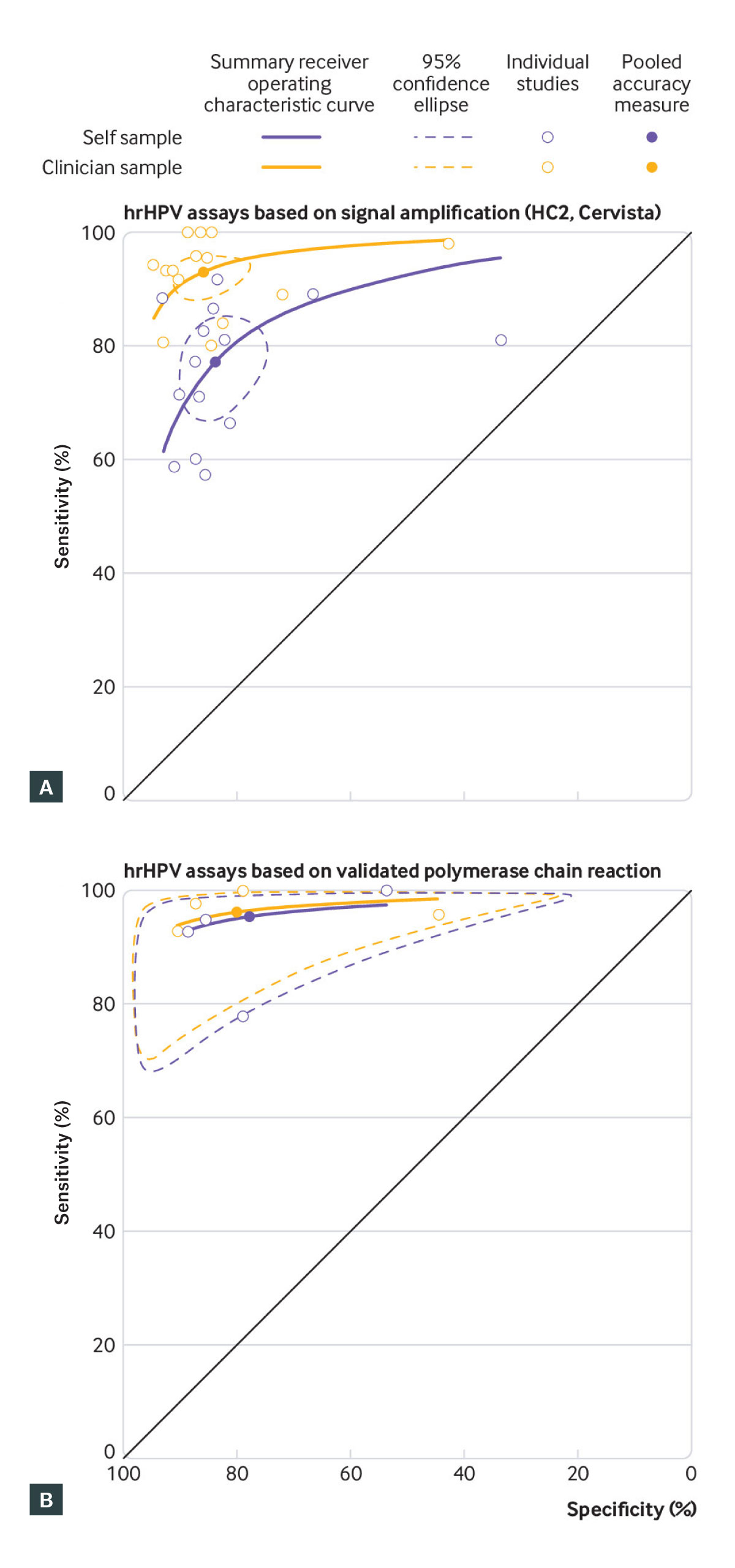 Figure 1. Meta-analysis of the accuracy of HPV assays for CIN2+ based on (a) signal amplification and (b) PCR for self- and clinician-collected samples in primary cervical screening. Estimates are derived from a bivariate model for pooling of diagnostic data.2