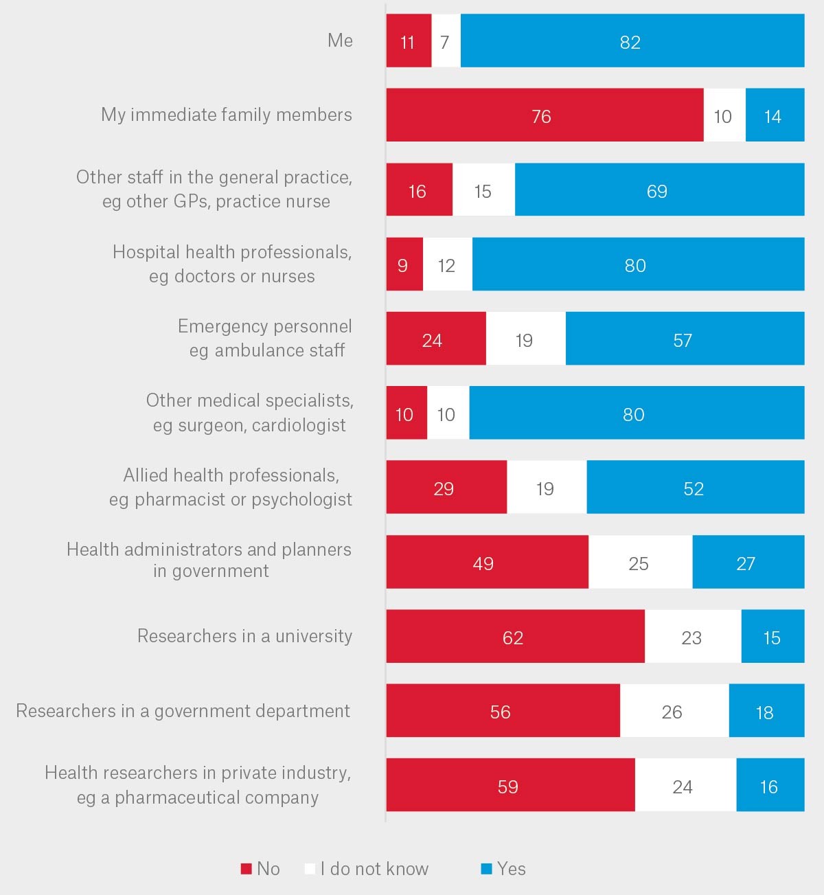 Much of the data sharing described in this paper is already occurring. Information is shared within general practices and with other health professionals and hospitals. Many general practitioners also share data that have had identifiers removed with government and researchers, and such sharing is likely to increase. The Australian Government’s recently released blueprint for the next decade of primary health care26 and the recent General Practice Crisis Summit White Paper from The Royal Australian College of General Practitioners (RACGP)27 both argue that the primary health care system of the future must be underpinned by comprehensively and systematically gathered primary care and general practice data. The key finding of this paper is that some Australians do not know how their health information is already being shared related to their clinical care, and a greater proportion do not know that their health information is being shared for purposes that are not directly related to their care.