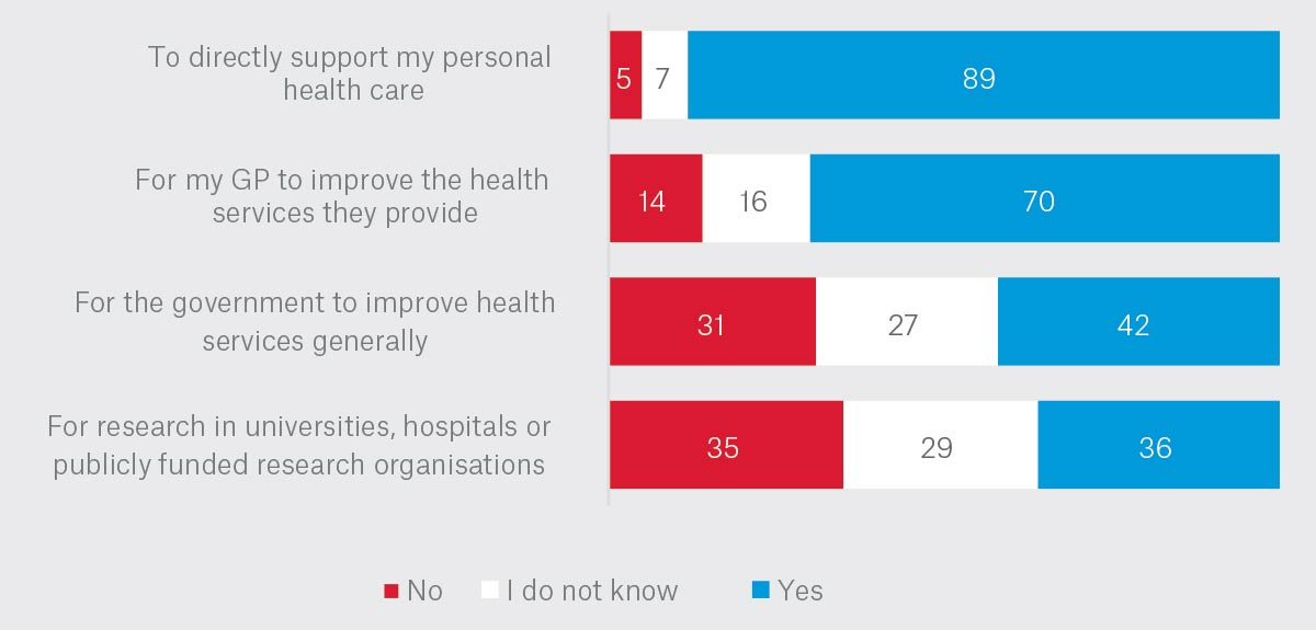 Figure 2. Participant responses (%) to the question ‘Do you think information in your general practice record is being shared for the following reasons?’