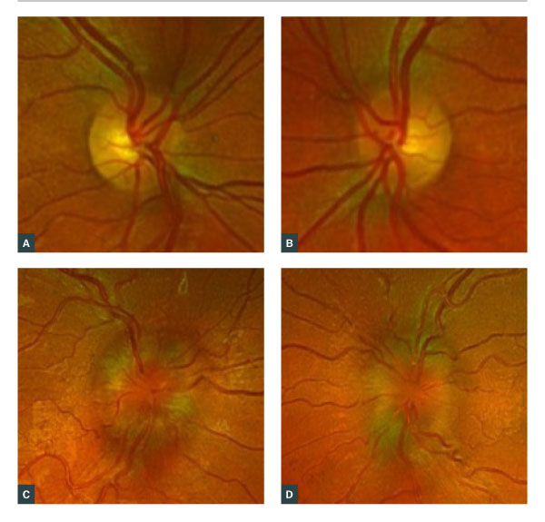 Figure 1. False-colour images showing normal (a) right and (b) left optic nerve heads; and swollen (c) right and (d) left optic nerve heads.