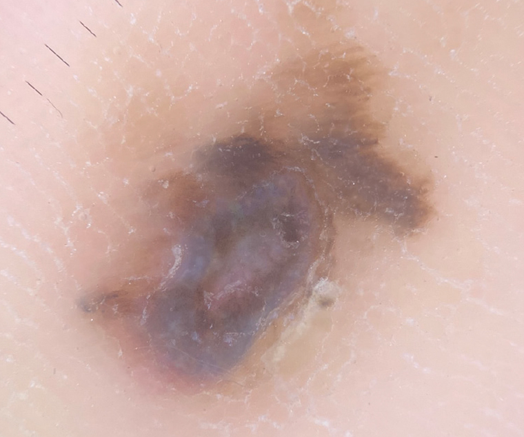 Although haemorrhage can present as red–black structureless blotches on dermoscopy, the lack of history of trauma and duration of presence rule out this benign presentation.2