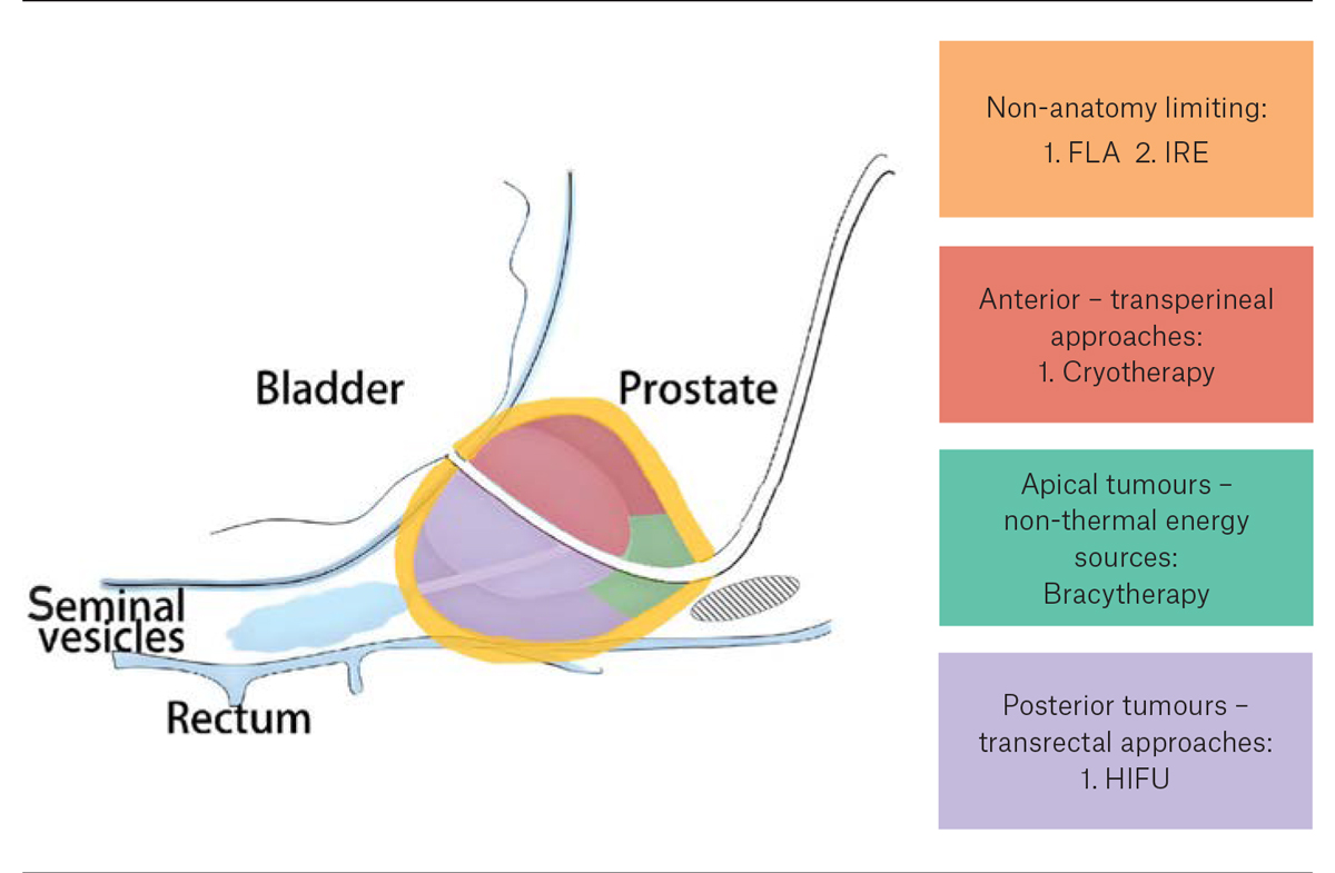 Anatomy is also a factor to consider when choosing between modalities of FT (Figure 1). For example, thermal energy sources such as cryotherapy or HIFU are not best suited for treating tumours located near the prostatic apex because of the risk of damage to the urethral sphincter.38 Anteriorly located tumours are more readily accessible by transperineal treatment approaches such as FLA and cryotherapy, whereas posteriorly located tumours might be more easily reached transrectally, such as with HIFU.39