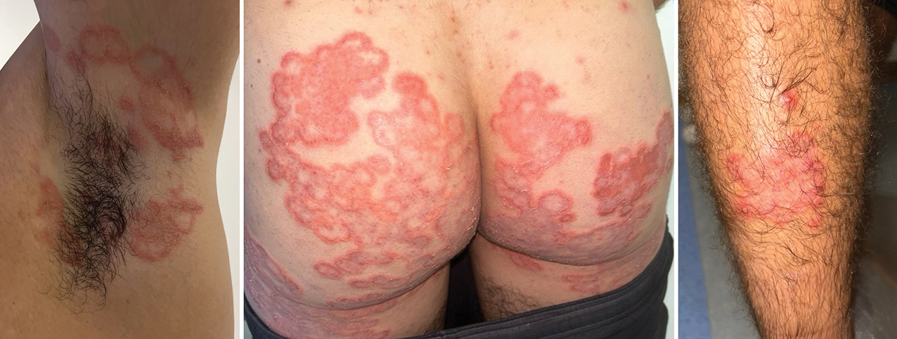 Figure 1A, B. Erythematous figurate and annular rash on the left axilla and buttocks with central clearing and evidence of some leading scale at the advancing edge; C. Erythematous plaque with advancing border and pustules on the right shin.