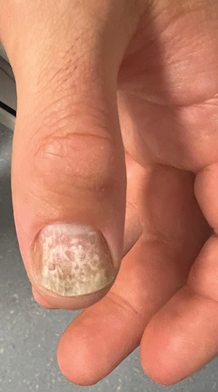 A man aged 25 years presented to the emergency department with a 2-week history of a painful and intensely pruritic rash on his buttocks that had spread to the axillae, inguinal folds and right shin (Figure 1). He also noted changes to his left thumbnail (Figure 2). He was otherwise well and worked as army personnel.